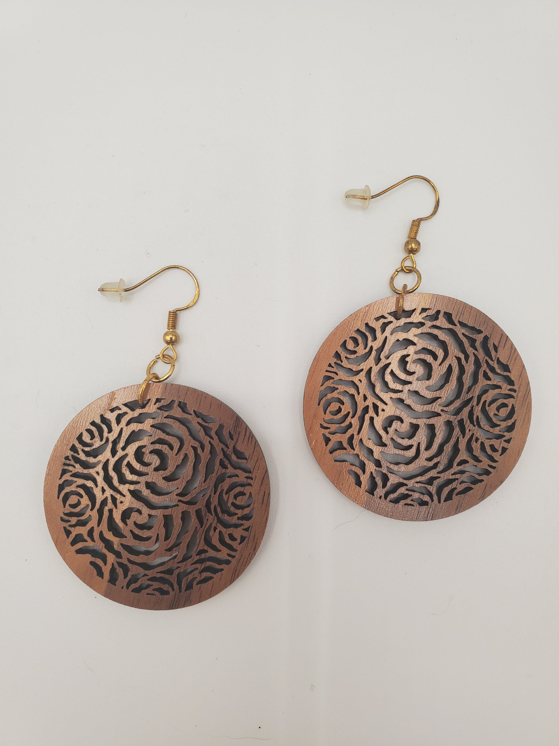 Beautiful lasered wooden "rosebud-themed" earrings made with cherry wood and are very light weight.